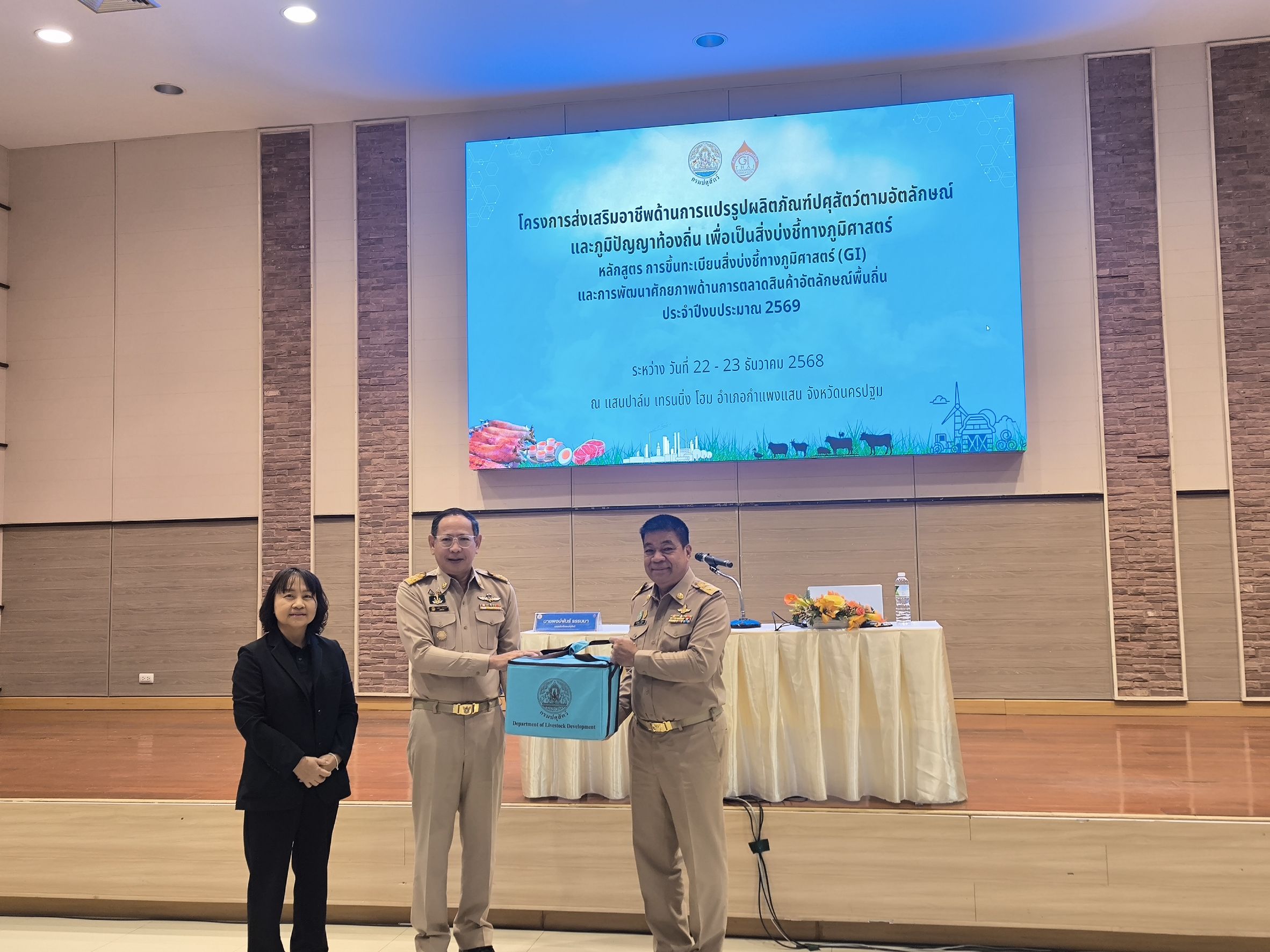 วันจันทร์ที่ 22 ธันวาคม 2568 นายสัตวแพทย์ยุษฐิระ บัณฑุกุล ปศุสัตว์เขต 7 พร้อมด้วย นายสุพัฒน์ เอี่ยมสอาด ผู้อำนวยการส่วนส่งเสริมและพัฒนาการปศุสัตว์ เข้าร่วมพิธีเปิดการฝึกอบรมโครงการส่งเสริมอาชีพด้านการแปรรูปผลิตภัณฑ์ปศุสัตว์ หลักสูตร การขึ้นทะเบียนสิ่งบ่งชี้ทางภูมิศาสตร์ GI และการพัฒนาศักยภาพด้านการตลาดสินค้าอัตลักษณ์พื้นถิ่น ประจำปีงบประมาณ 2569 จัดขึ้นระหว่างวันที่ 22-23 ธันวาคม 2568 ณ แสนปาล์ม เทรนนิ่ง โฮม อำเภอกำแพงแสน จังหวัดนครปฐม