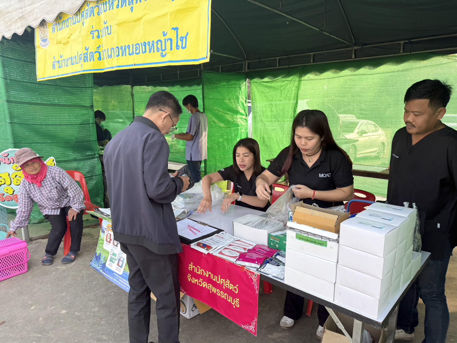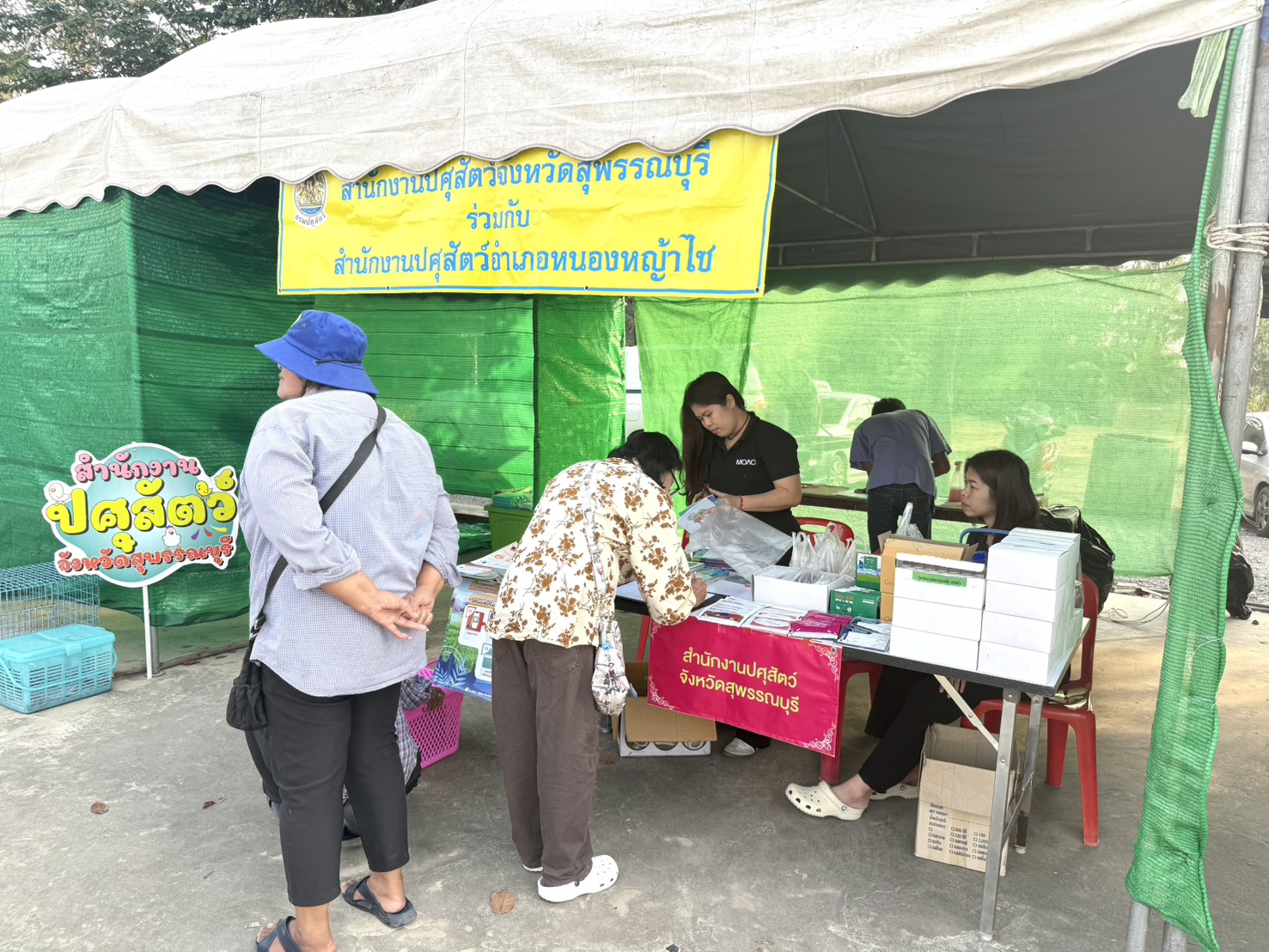 ในการนี้ สำนักงานปศุสัตว์จังหวัดสุพรรณบุรี ได้ร่วมจัดนิทรรศการ ให้บริการคลินิกสัตว์เพื่อให้คำปรึกษาแก่เกษตรกรผู้เลี้ยงสัตว์ในพื้นที่ รวมถึงผ่าตัดทำหมันสุนัข-แมว และมอบยาเวชภัณฑ์ต่างๆ ให้แก่เกษตรกรที่มาใช้บริการจำนวนทั้งสิ้น 40 ราย ฉีดวัคซีนโรคพิษสุนัขบ้า จำนวน 25 ตัว และผ่าตัดทำหมันสุนัข เพศเมีย จำนวน 2 ตัว แมว จำนวน 13 ตัว แยกเป็น เพศผู้ 2 ตัว เพศเมีย 11 ตัว