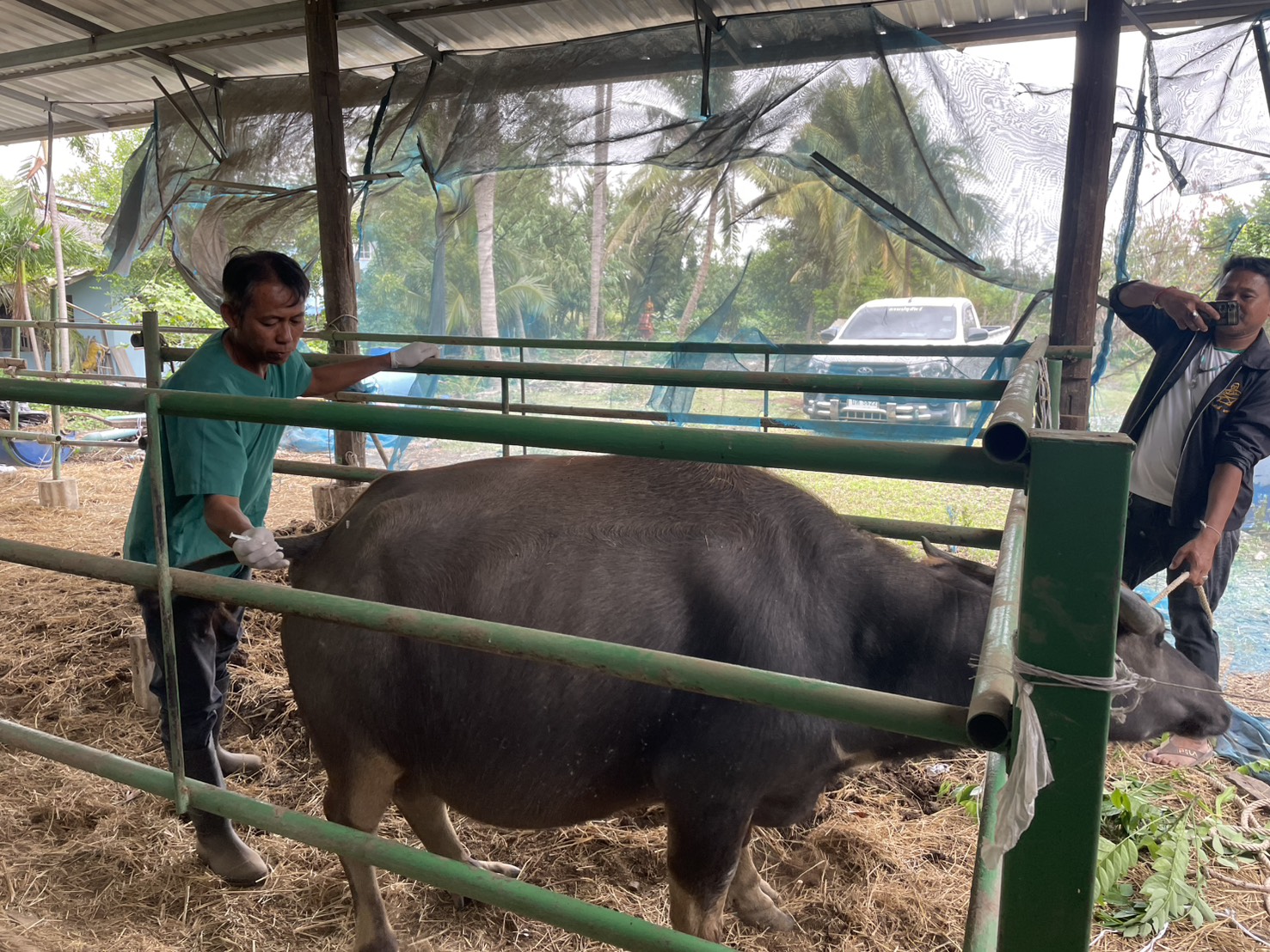 วันที่ 18 พฤศจิกายน 2568 นายชัชชาย เต็งหงษ์เจริญ ปศุสัตว์จังหวัดสุพรรณบุรี มอบหมายให้ นายธีระพงษ์ จริยารังษีโรจน์ ปศุสัตว์อำเภออู่ทอง พร้อมด้วยเจ้าหน้าที่สำนักงานปศุสัตว์อำเภออู่ทอง ดำเนินการตรวจติดตามกระบือพระราชทาน พร้อมตรวจระบบสืบพันธุ์และฉีดวัคซีนป้องกันโรคเฮโมรายิกเซพติซีเมีย รวมทั้งได้ให้คำแนะนำแก่เกษตรกรเรื่องการจัดการดูแลสุขภาพสัตว์ การจัดการฟาร์มให้มีระบบความปลอดภัยทางชีวภาพ (Biosecurity) ในพื้นที่ ตำบลจรเข้สามพัน และ ตำบลสระพังลาน อำเภออู่ทอง จังหวัดสุพรรณบุรี
